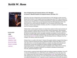 Bio: Keith Ross is the Leonard J. Shustek Chair Professor in Computer Science at Polytechnic Institute of NYU. Before joining NYU-Poly in 2003, he was a professor at University of Pennsylvania (13 years) and a professor at Eurecom Institute (5 years). He received a B.S.E.E from Tufts University, a M.S.E.E. from Columbia University, and a Ph.D. in Computer and Control Engineering from The University of Michigan.