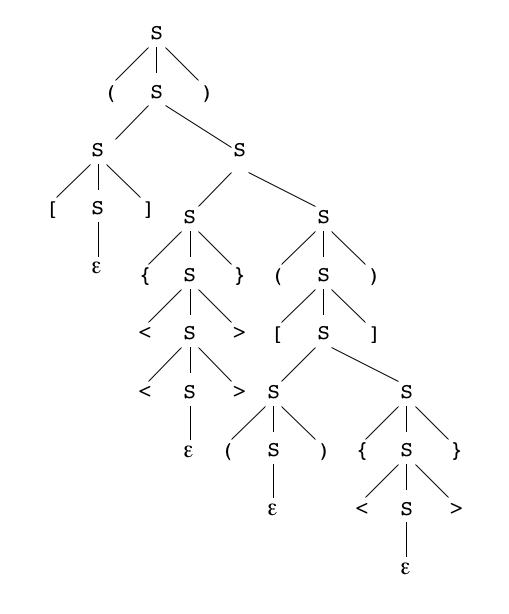 ![]() Les quatre sortes de traits dans l'arbre symbolisent les quatre sortes de parenthèses dans le langage. |
